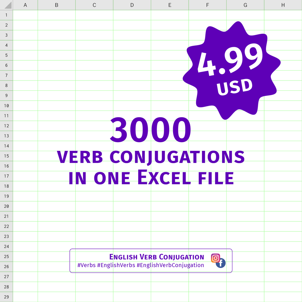 🇺🇸 This Excel file contains more than 3000 verb conjugations. Ideal for everybody who wants to learn English. Use this excel to practice conjugating verbs or use as a reference chart for verb tenses in more advanced levels. Learn Verb Forms easily using this Excel file and improve your English.